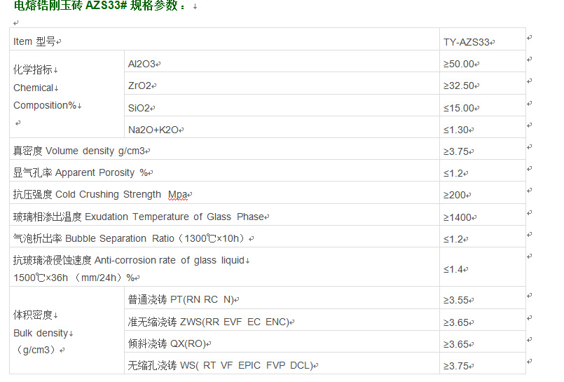 電熔鋯剛玉磚電熔鋯剛玉磚AZS33#:AZS33#鋯剛玉磚致密的顯微結構使得磚的耐玻璃液侵蝕性能好,在玻璃窯中不易產生結石或···
