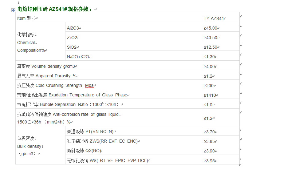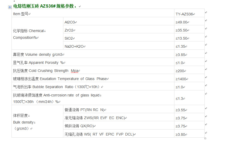 電熔鋯剛玉磚AZS33#:AZS33#鋯剛玉磚致密的顯微結構使得磚的耐玻璃液侵蝕性能好,在玻璃窯中不易產生結石或其它缺陷。它是玻璃窯爐中使用最為廣泛的產品,主要適用于熔化池的上部結構,工作池的池壁磚和鋪面磚,料道等。AZS33是熔鑄AZS系列產品中的使用量最大,最廣泛的茶品,在防止污染玻璃液方面性能優越。廣泛地使用在玻璃窯爐的池壁,池底,上部結構和供料道等部位。電熔鋯剛玉磚AZS36#:除了具有和AZS33#電熔鋯剛玉磚相同的共結晶體外,36#AZS磚由于增加較多的鏈鎖狀氧化鋯結晶體,同時玻璃相···