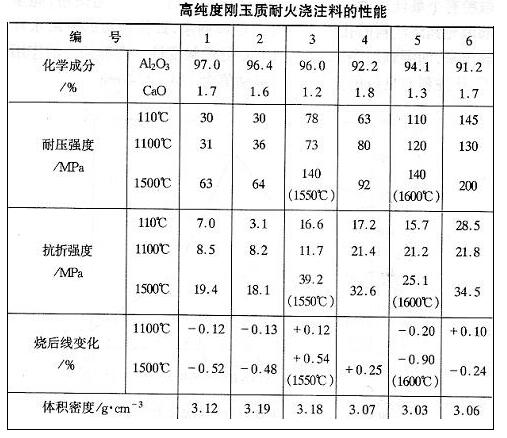 下表為高純度剛玉質耐火澆注料的性能。表中編號1~編號3采用電熔白剛玉作耐火骨料及部分粉料:編號4和編號5分別采用板狀剛玉和致密剛玉作耐火骨料,用致密剛玉做部分粉料:編號6采用特級礬土熟料和電熔白剛玉作耐火骨料,用白剛玉作部分分了。耐火粉料中均添加適量的α-AL2O3和SiO2超微粉:編號1用CA-80水泥做結合劑,其余編號料用CA-70水泥做結合劑。同時,均添加分散劑和減水劑。該類水泥一般易速凝,影響施工性。一有此情況,應添加草酸和檸檬酸鈉燈緩凝劑,以保證澆注料的流動性和密實性。從表中看出,AL2O3和CaO的總含量出編號4和編號6外都大于95%,高的達98.7%,說明該料是高純度的。同時,體積密度大,強度高,但1500℃或1600℃燒后線變化除編號3和編號4外,均呈收縮狀態。